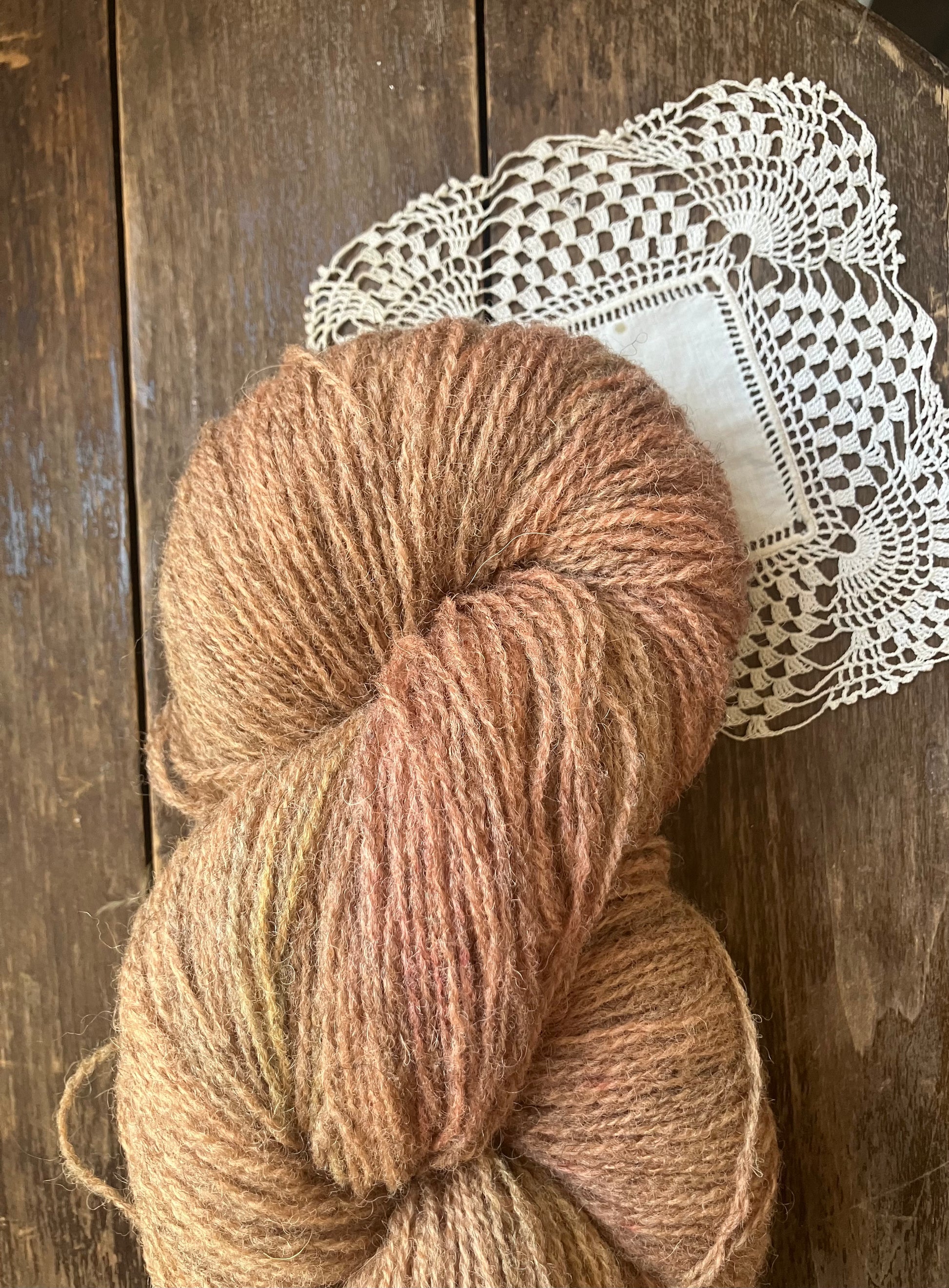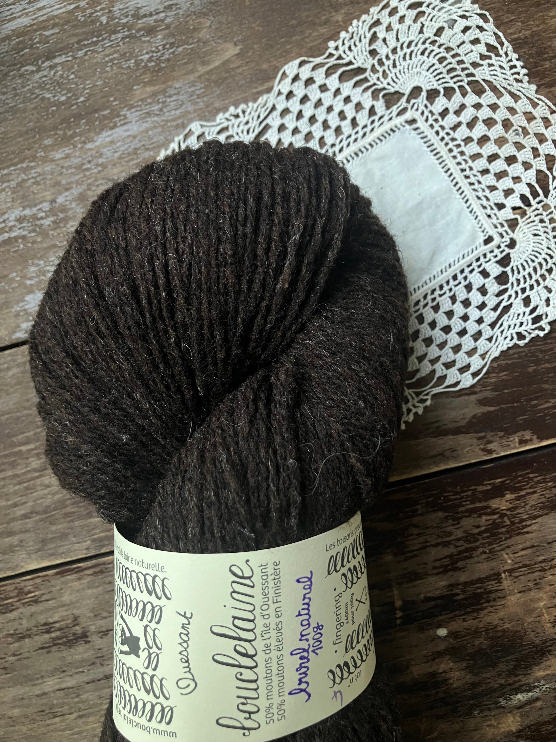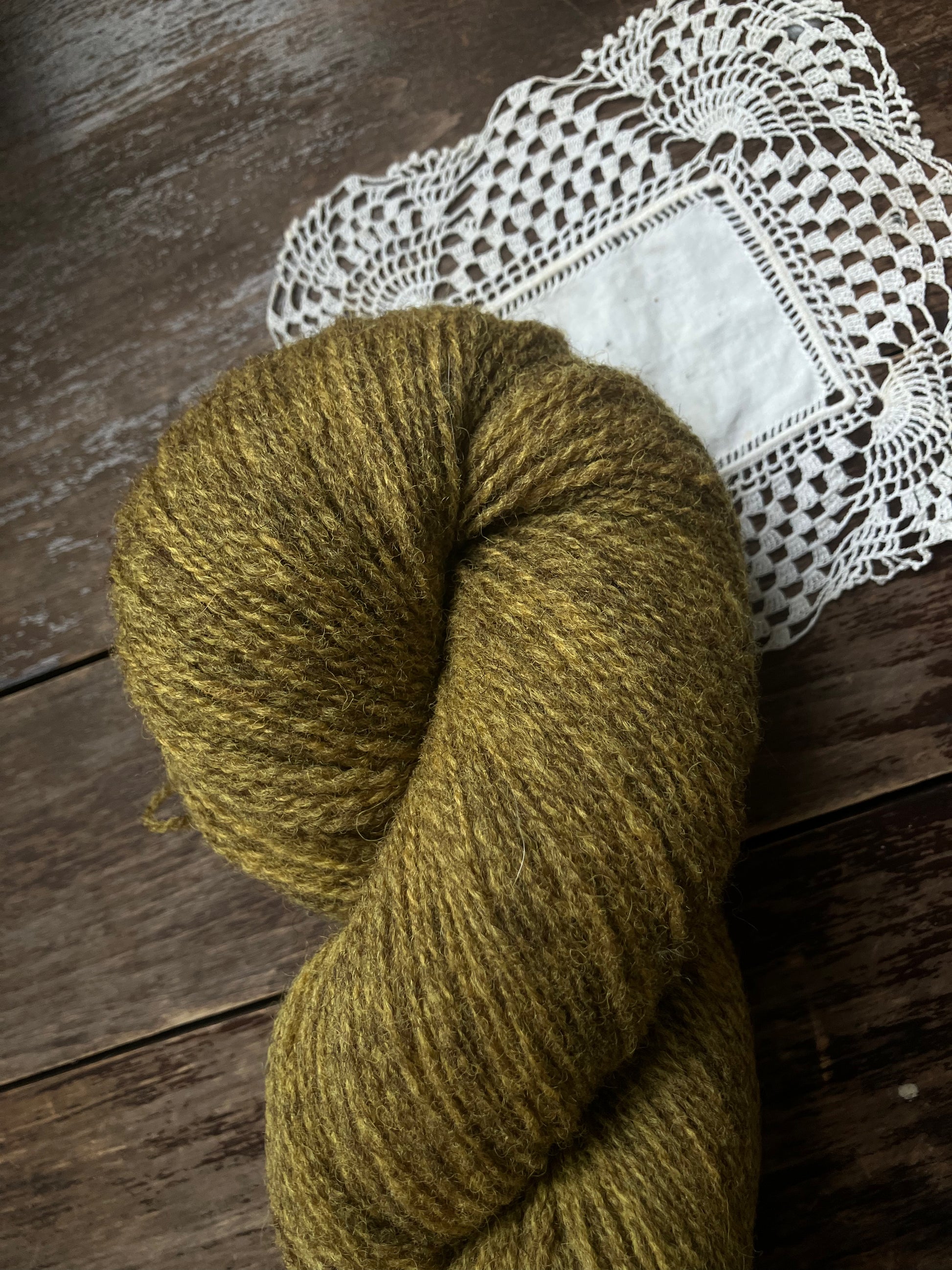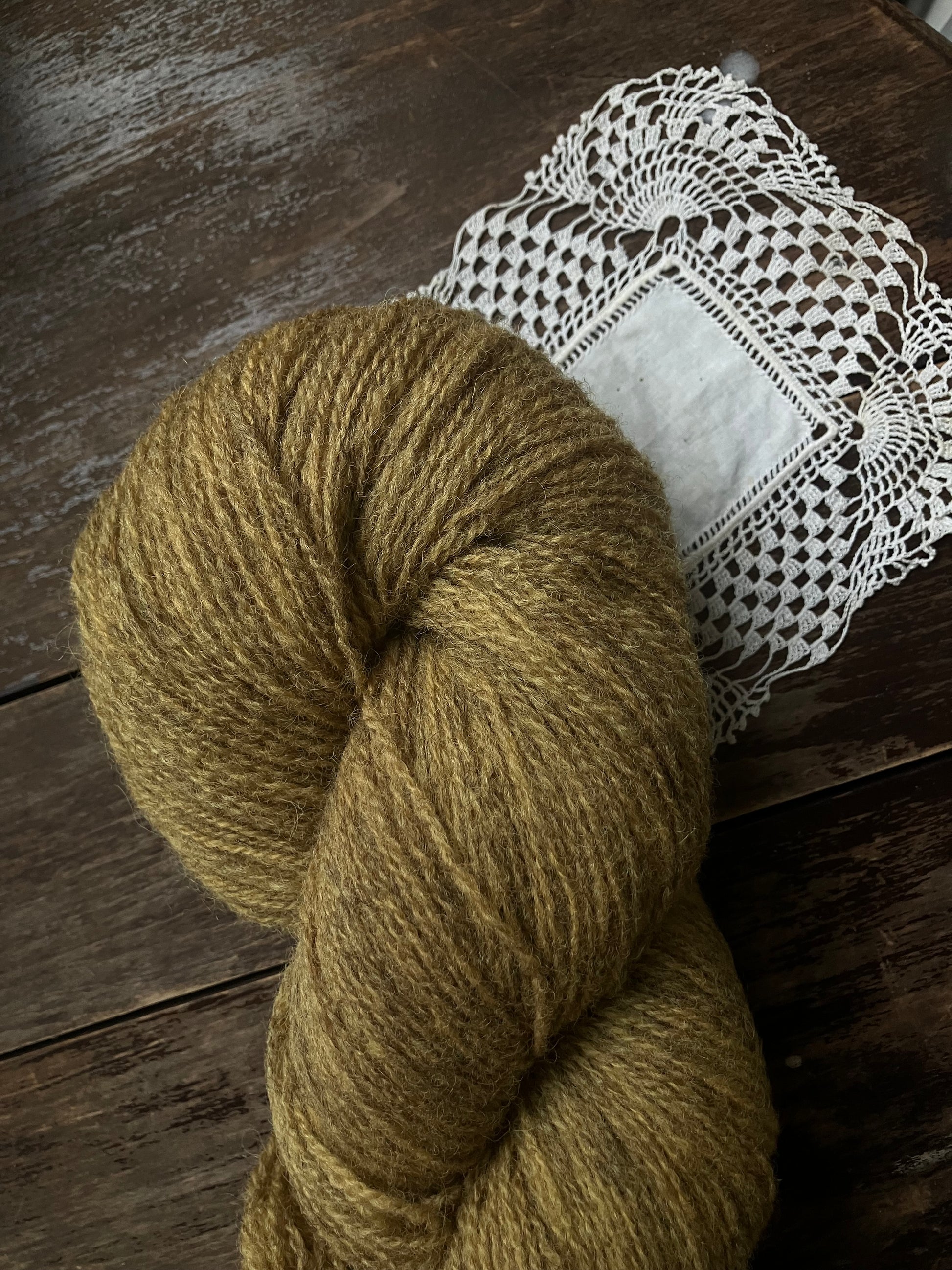 Naturally dyed fingering weight yarn from Ouessant wool.