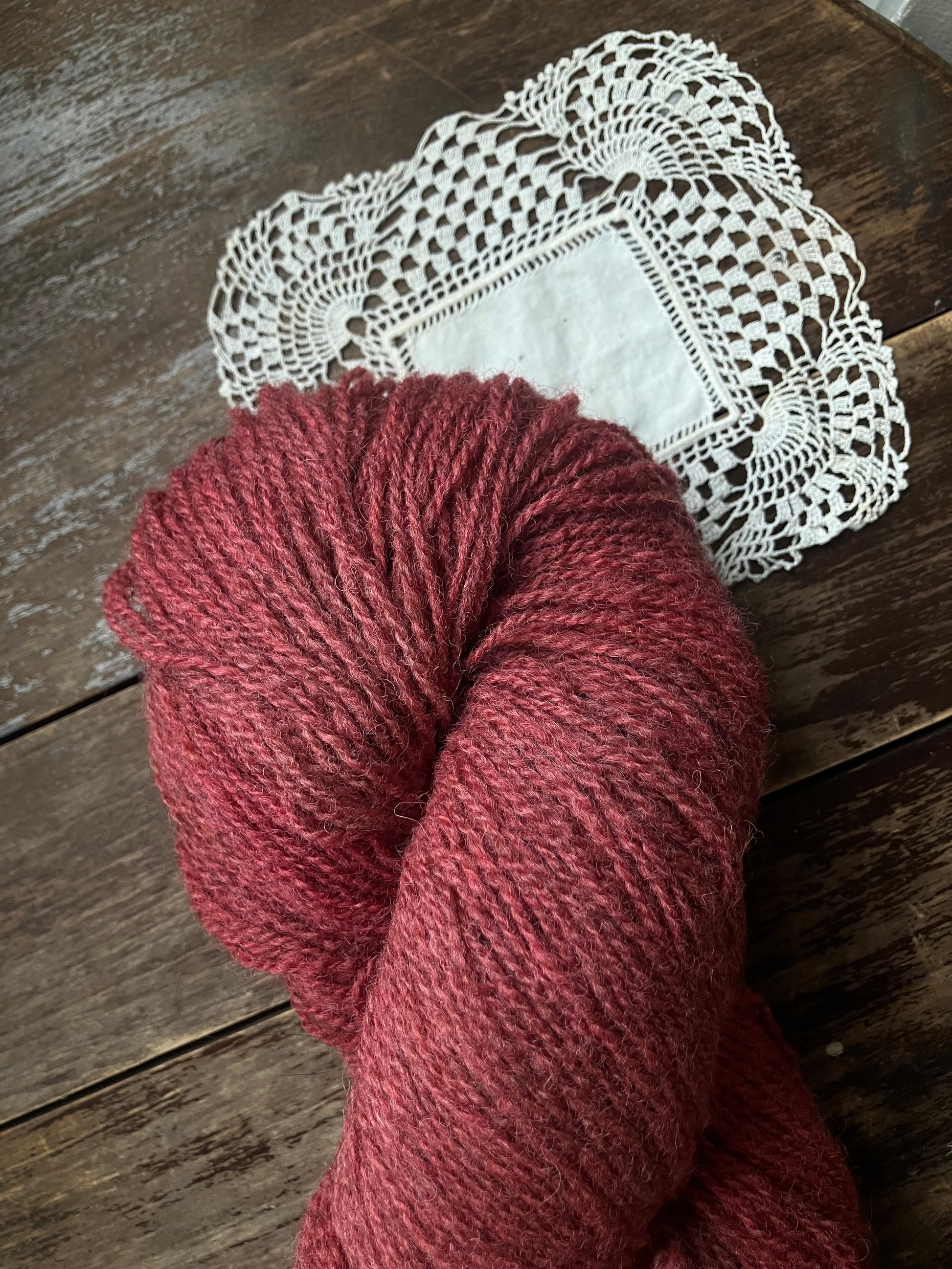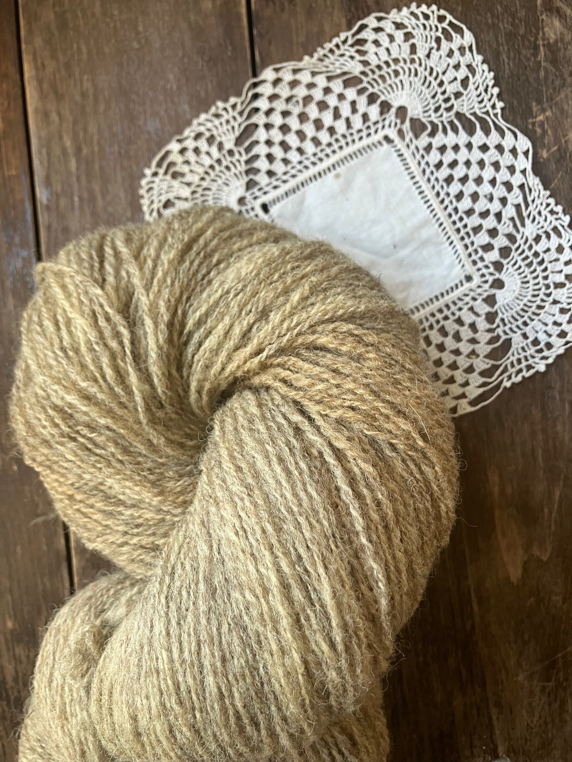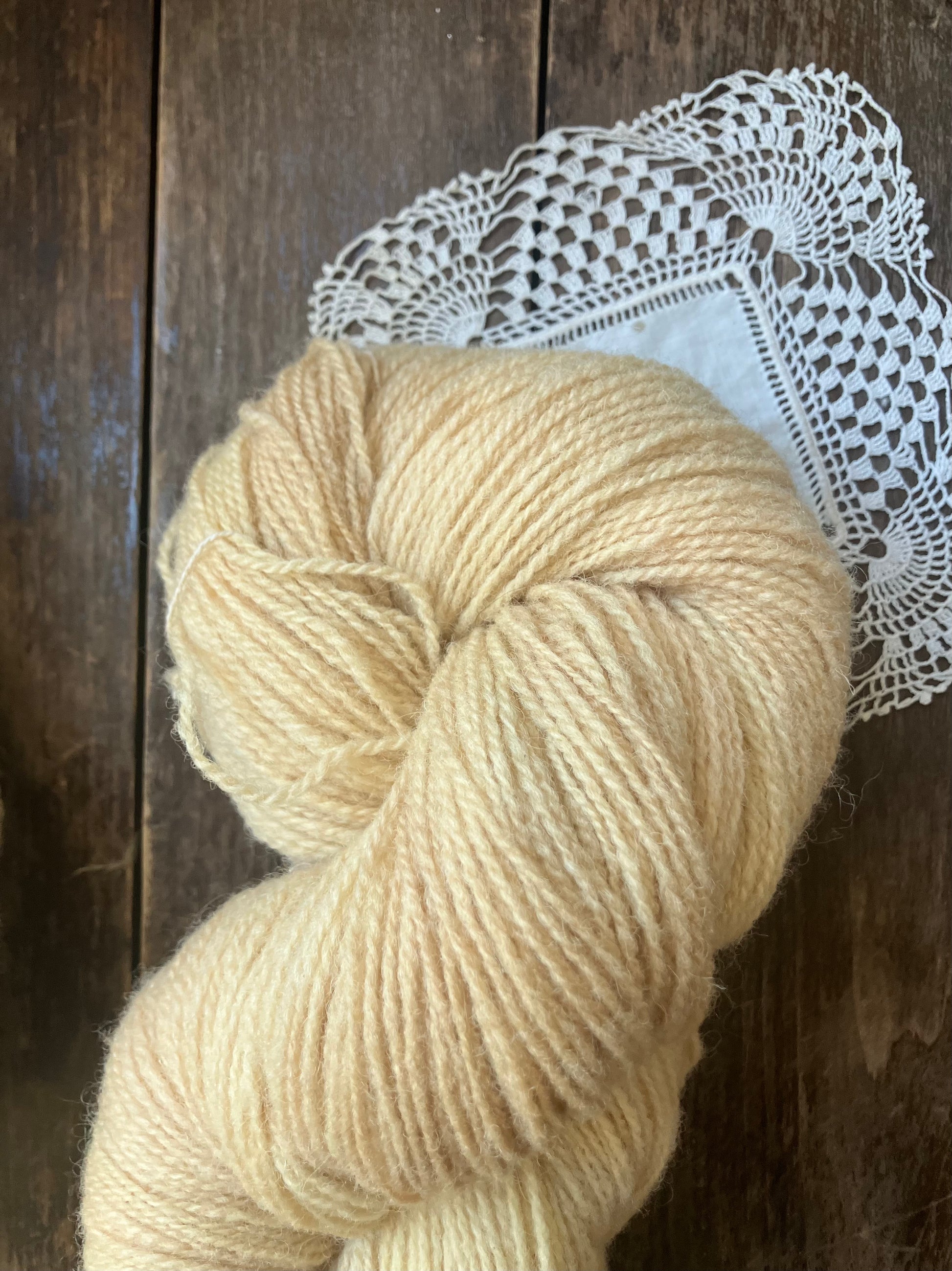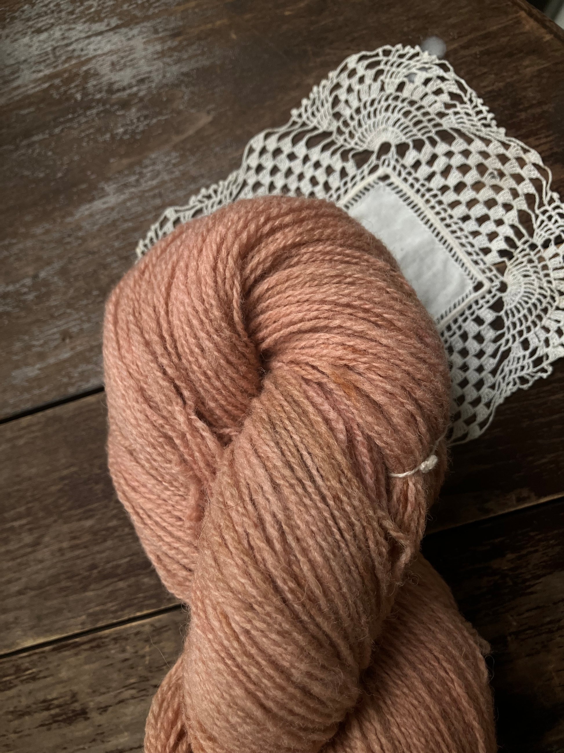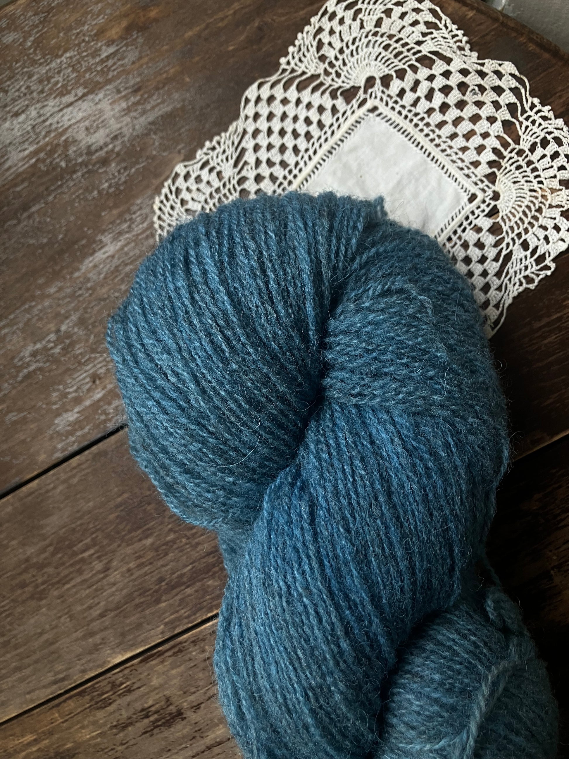 Naturally dyed fingering weight yarn from Ouessant wool.